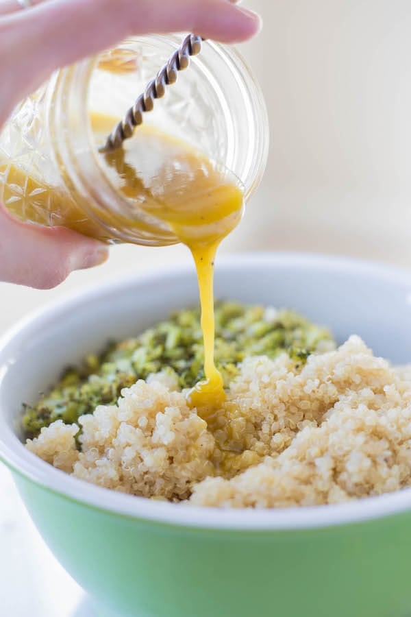 roasted broccoli quinoa salad with honey mustard dressing (use maple syrup instead of honey for vegan option)