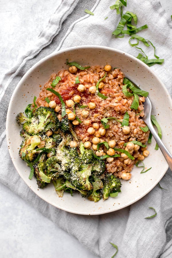 One of the easiest meals on this list! It comes together in a snap, requires minimal ingredients, and is SO filling. Farro is a fairly new-to-me ingredient, but man is it tasty. Perfectly chewy and nutty in flavor. Add your favorite store-bought marinara or go all-out and make your own!
