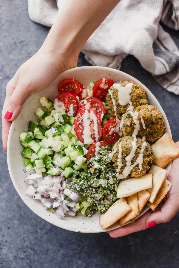 I go crazy over these flavors and colors! It’s so fresh and flavorful for spring or summer, and so simple to throw together. The lemon herb quinoa falafel on top are filling, tasty, and super easy to heat up right before you dig in.