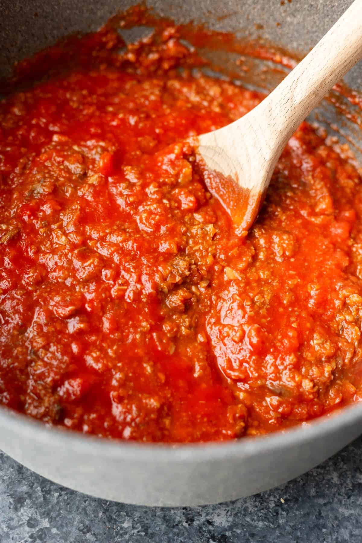 Cooking this sauce over the course of an hour or two really helps the flavors develop and the texture to become more meaty. You’ll also immersion blend the sauce a bit to make it a bit more bolognese-y versus chunks of vegetables in tomato sauce-y.