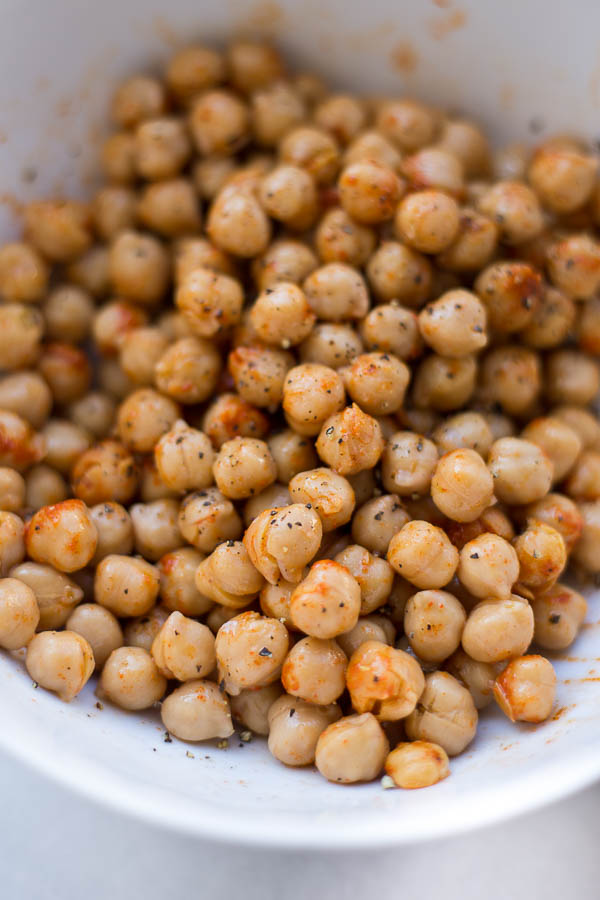 - Add chickpeas to a small bowl. Cover with olive oil, salt, pepper, and cayenne, and mix to combine. Set aside.