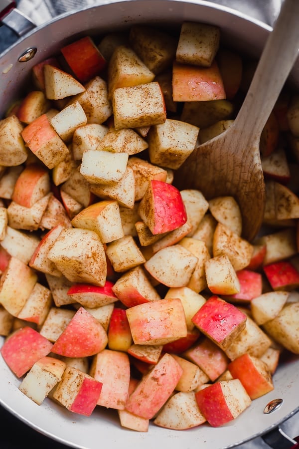 - Place your large pot over medium heat, add your water, and cover. Cook, stirring frequently for 10-15 minutes, or until the apples are cooked to your liking. I like my apples to be on the crisper side, so I prefer pulling it off the heat around the 10 minute mark. Around the last minute of cooking, add your cornstarch and mix to combine.