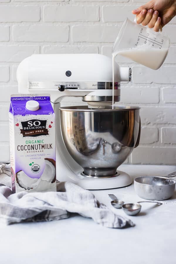 - Add your vegan butter, one chunk at a time, with the stand mixer running on low. Drizzle in your coconutmilk and mix until the dough forms a ball and pulls away from the sides of the bowl.